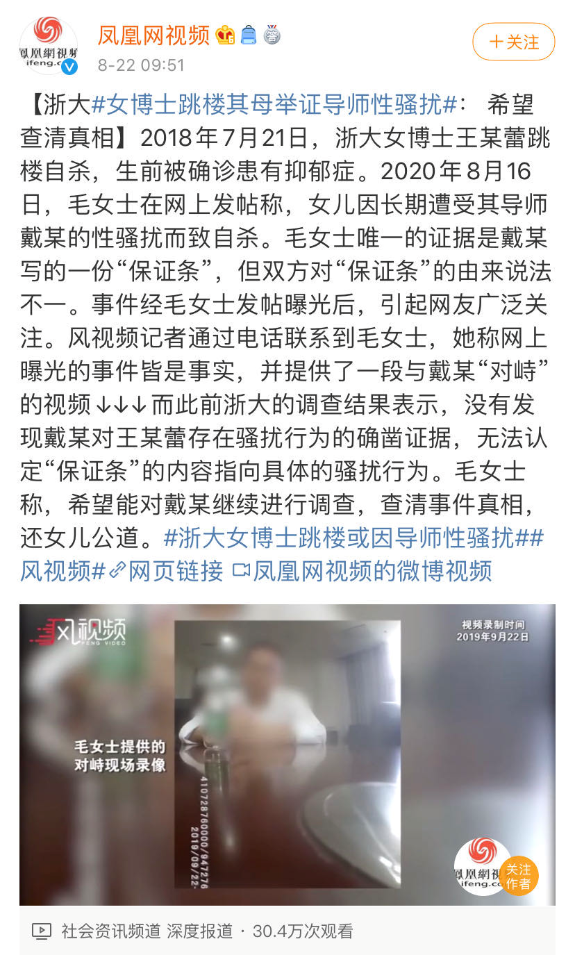 2020年8月27日,澎湃新闻(www.thepaper)从浙江大学党委、校办处获悉,对于王某蕾一事,校方也在关注处理,此事由学校党委教师工作部负责调查。8月17日,王某蕾的母亲微博发文讲述女儿的经历,并控诉浙江大学农业与生物技术学院农学系教授戴某。