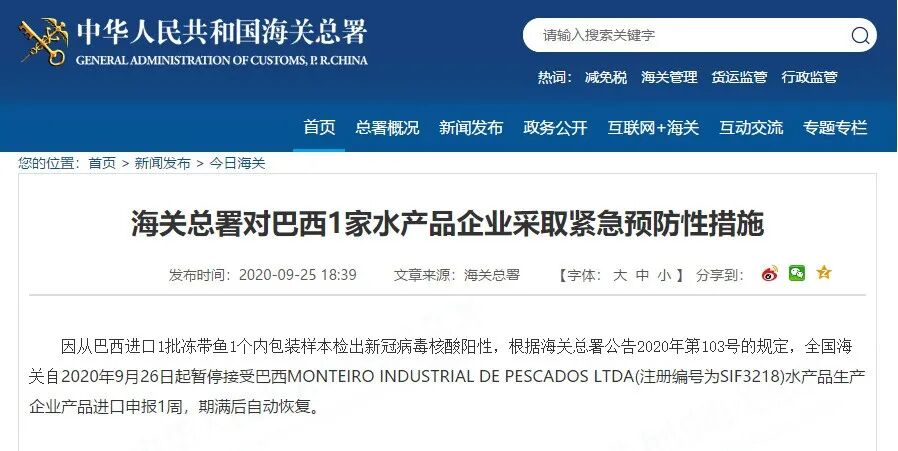 9月25日,据海关总署官网消息,海关总署对巴西1家水产品企业采取紧急预防性措施:
