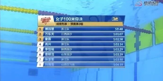 9月26日,在青岛举行的2020年全国游泳冠军赛上,傅园慧在女子100米仰泳预赛中以59秒48的成绩排名第一。