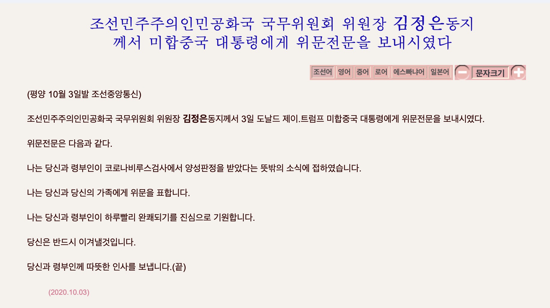 据朝中社3日报道,朝鲜最高领导人金正恩当天向美国总统特朗普致慰问电。金正恩表示,向新冠病毒检测结果为阳性的特朗普及其夫人表示慰问。金正恩真心地祝愿特朗普及其夫人早日康复。(总台记者 董海涛)