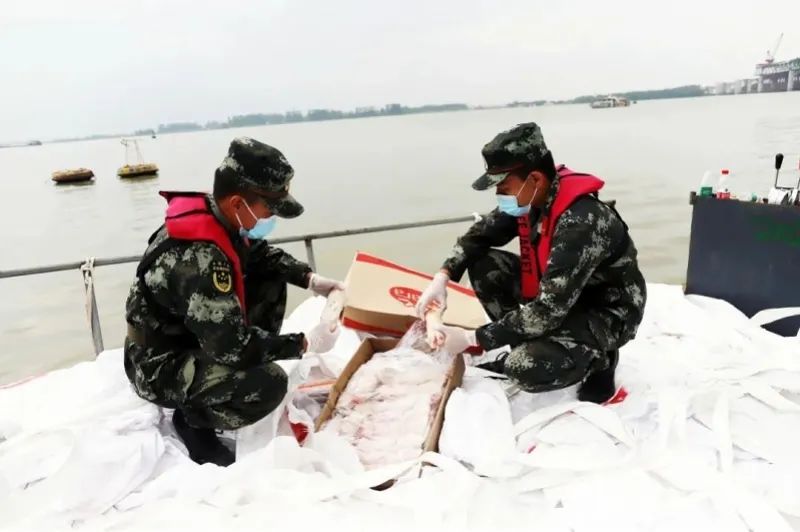 10月5日凌晨,广东广州海警局执勤舰艇在南沙港和舢板洲海域巡逻时先后查获涉嫌走私冻品的“三无”船舶2艘,船上载有外文标识且无合法证明的冻品约30吨。