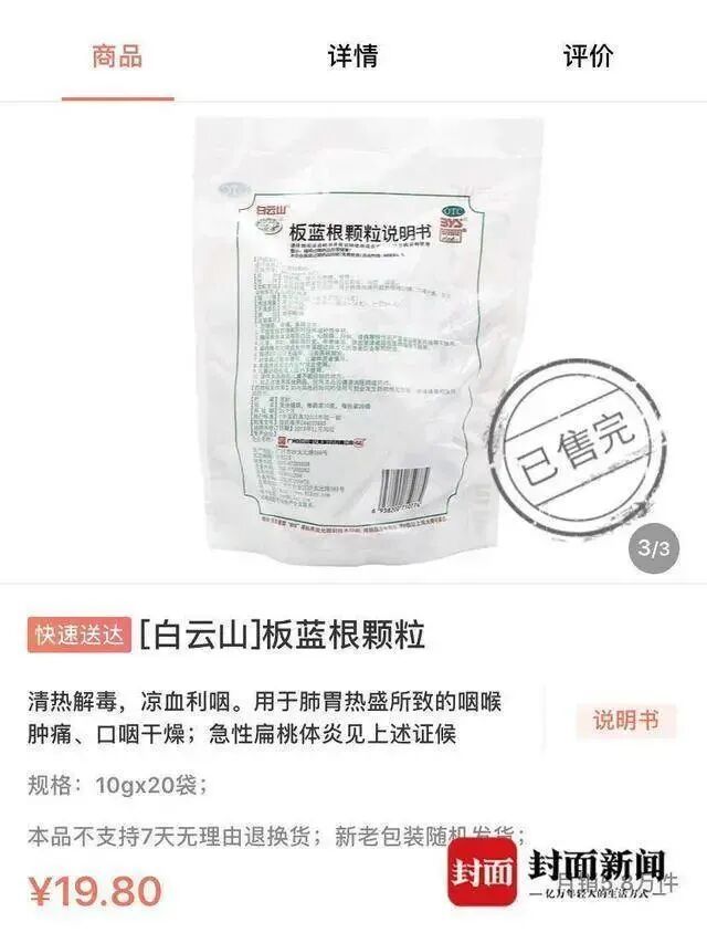 记者在网上药店查询也发现,京东大药房、阿里大药房、广药白云山官方旗舰店的复方板蓝根,都已经卖断货了。其中,京东自营的“白云山复方板蓝根颗粒(10g*20袋)”,北京地区处于采购中,10月20日后才有货。