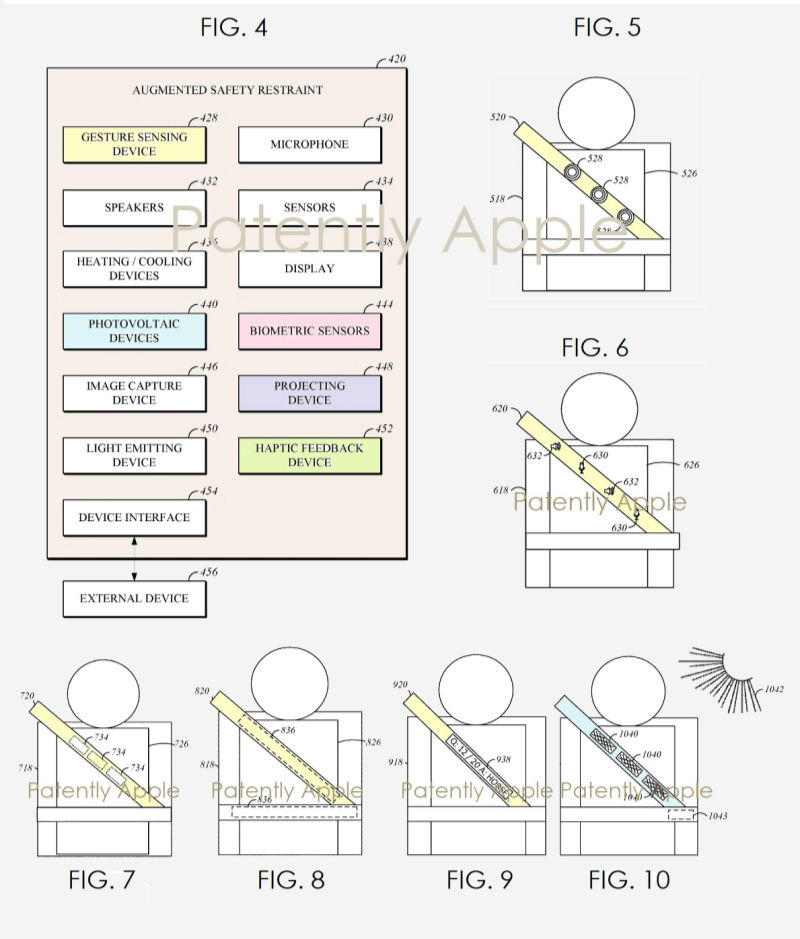 在 2019 年公布的一项专利中,苹果在最不起眼的安全带上动了手脚。根据专利描述的信息,在采用自动驾驶模式后,用户在车内就拥有了休闲时间,可以与他人交流或者观看内容。安全带在其中,就起到了一个‘操作核心’的作用。