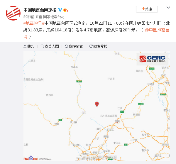 #地震快讯#中国地震台网正式测定:10月22日11时03分在四川绵阳市北川县(北纬31.83度,东经104.18度)发生4.7级地震,震源深度20千米。( @中国地震台网 )