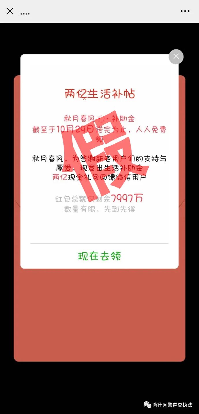 据喀什网警发布,近日有微信群以发放疫情补贴为名传播虚假红包链接。