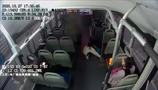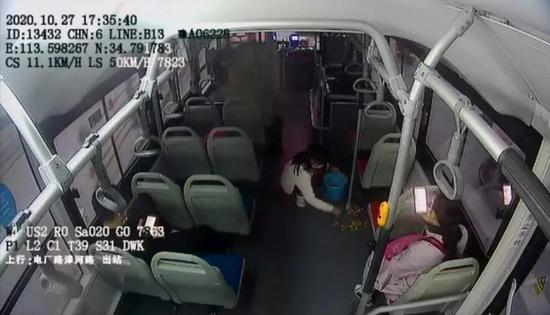 就在阿姨下车的同时,一位约莫八九岁的小姑娘上车了。上车后,小女孩儿就坐在散落点心的旁边,她看了看地上散落的点心,又看了看上车的乘客,感觉这些东西会为车上来回走动对乘客造成不方便。接着,令人感动的一幕出现了:小女孩儿放下身上背的书包,弯下腰开始捡起地上散落的点心。
