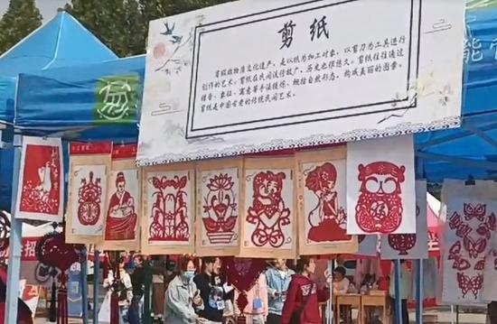 10月26日,郑州某高校社团招新现场,有一排全是展示的国家非物质文化,传承人穿着红艳艳的唐装,面前摆着各自传承的技艺向同学展示,让在校大学生可以更近距离的了解我们国家的非物质文化遗产。据八旬剪纸传承人介绍,剪纸伴其一生,很喜欢和年轻人一起,很乐意参加这样的活动。