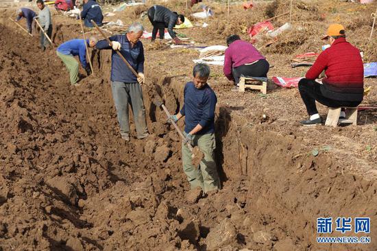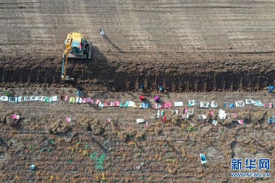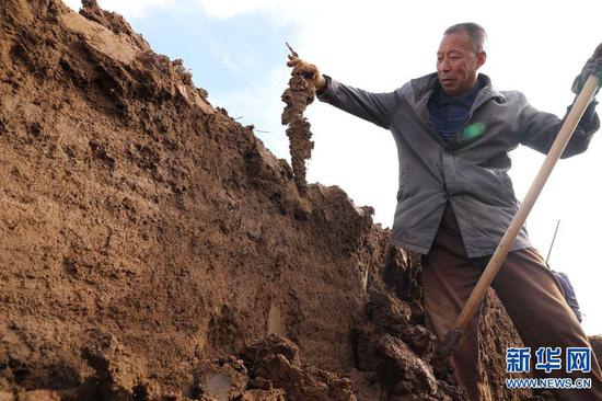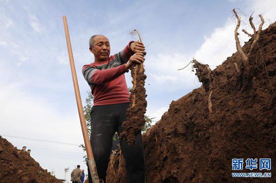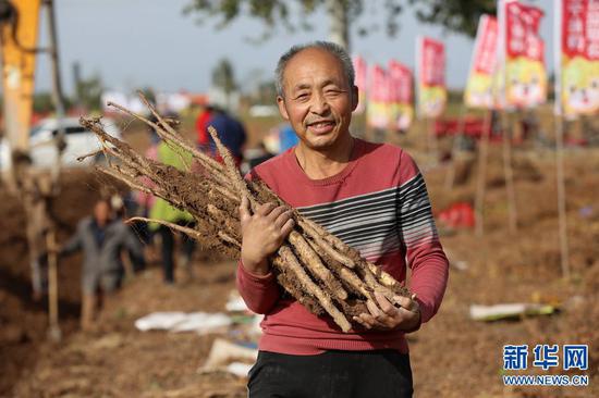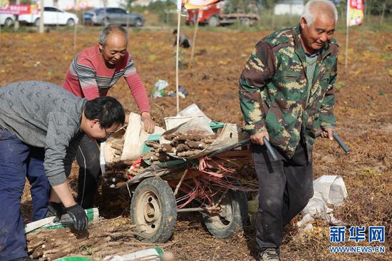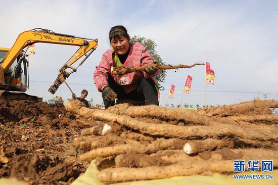 深秋时节,河南省温县种植的近3万亩铁棍山药陆续进入收获期,当地农民抓紧采收、加工、销售。近年来,该县充分利用“四大怀药”原产地的地域优势,发展“怀山药、怀菊花、怀地黄、怀牛膝”等特色种植,带动当地村民增收致富。新华网发(徐宏星 摄)