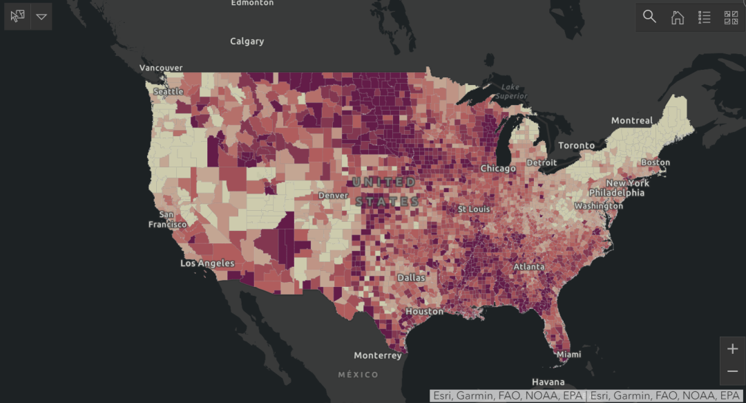 美国新冠确诊地图(颜色越深的地区确诊病例越多)