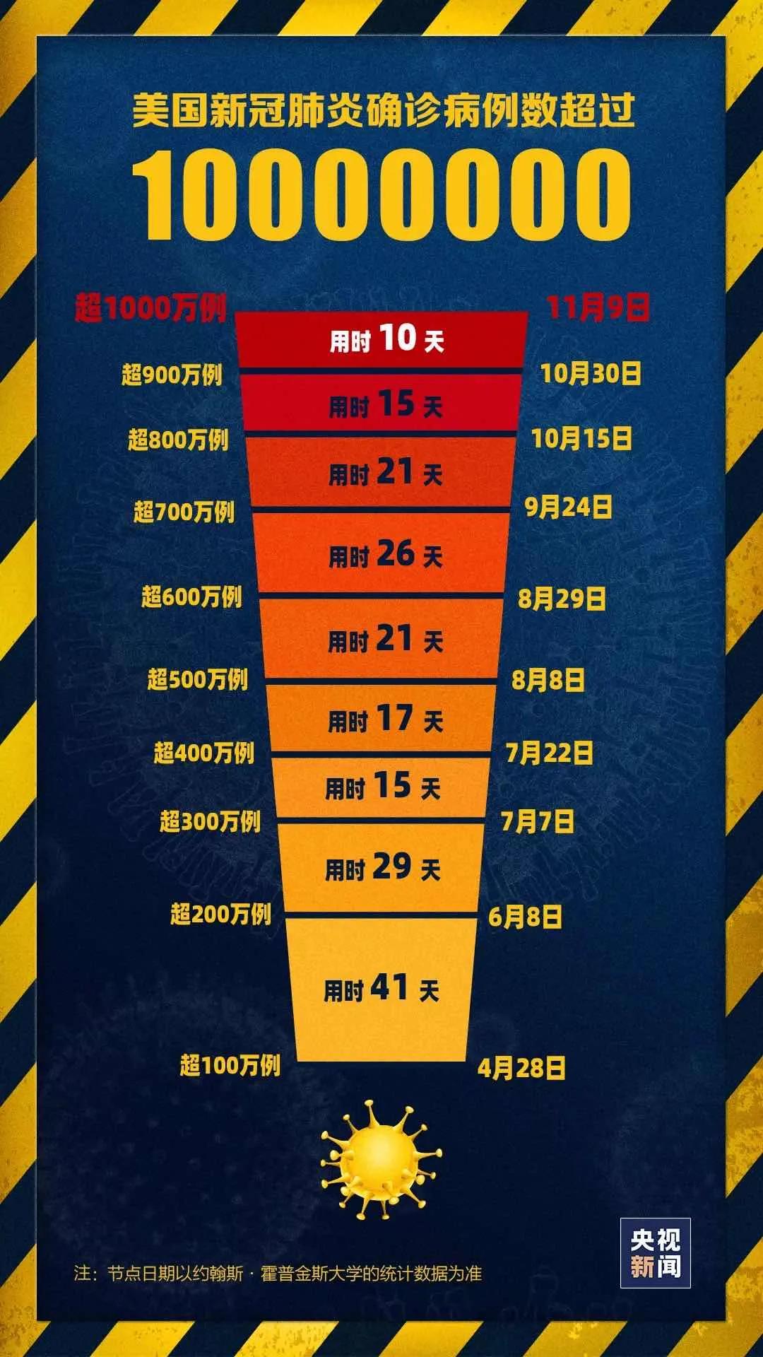 《华盛顿邮报》报道说,美国新冠肺炎累计确诊病例超过1000万,从900万上升至1000万仅用了10天时间,过去7日,美国平均单日新增确诊病例超过10万例。公共卫生专家警告说,美国正进入新冠疫情暴发以来“最严重的阶段”。
