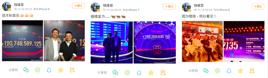 钱峰雷微博上晒得最多的还是“马爸爸”。他多次出现在马云身边,一起见证“双十一”成交纪录↓↓