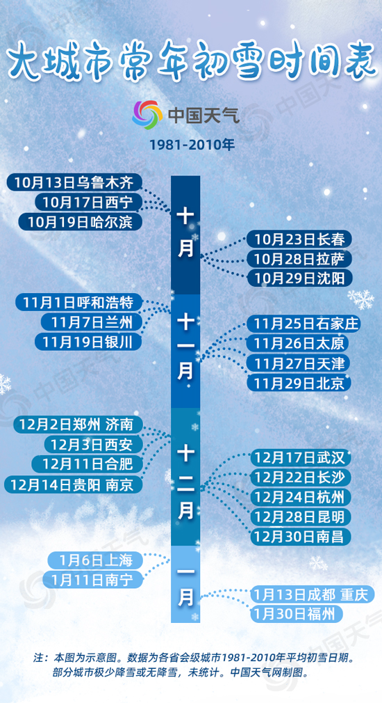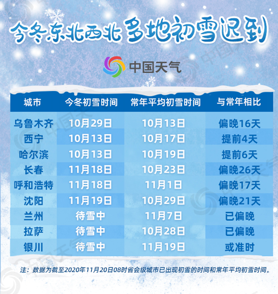 这个冬天,我国不少地方的初雪都迟到了。大城市中,除了哈尔滨和西宁比常年平均初雪时间略有提前外,长春、沈阳、呼和浩特、乌鲁木齐等城市都迟到10天以上,其中,长春偏晚26天。而与常年相比,拉萨、兰州的初雪已经注定迟到。