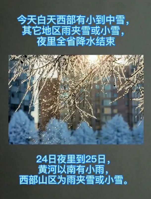 今天白天,全省阴天,三门峡、洛阳、平顶山、济源、焦作五地区和安阳、新乡、郑州、南阳四地区西部有小雪,其中三门峡、洛阳两地区和南阳地区西部部分地区有中雪,局部大雪;信阳地区有小雨或雨夹雪;其它地区有雨夹雪或小雪。