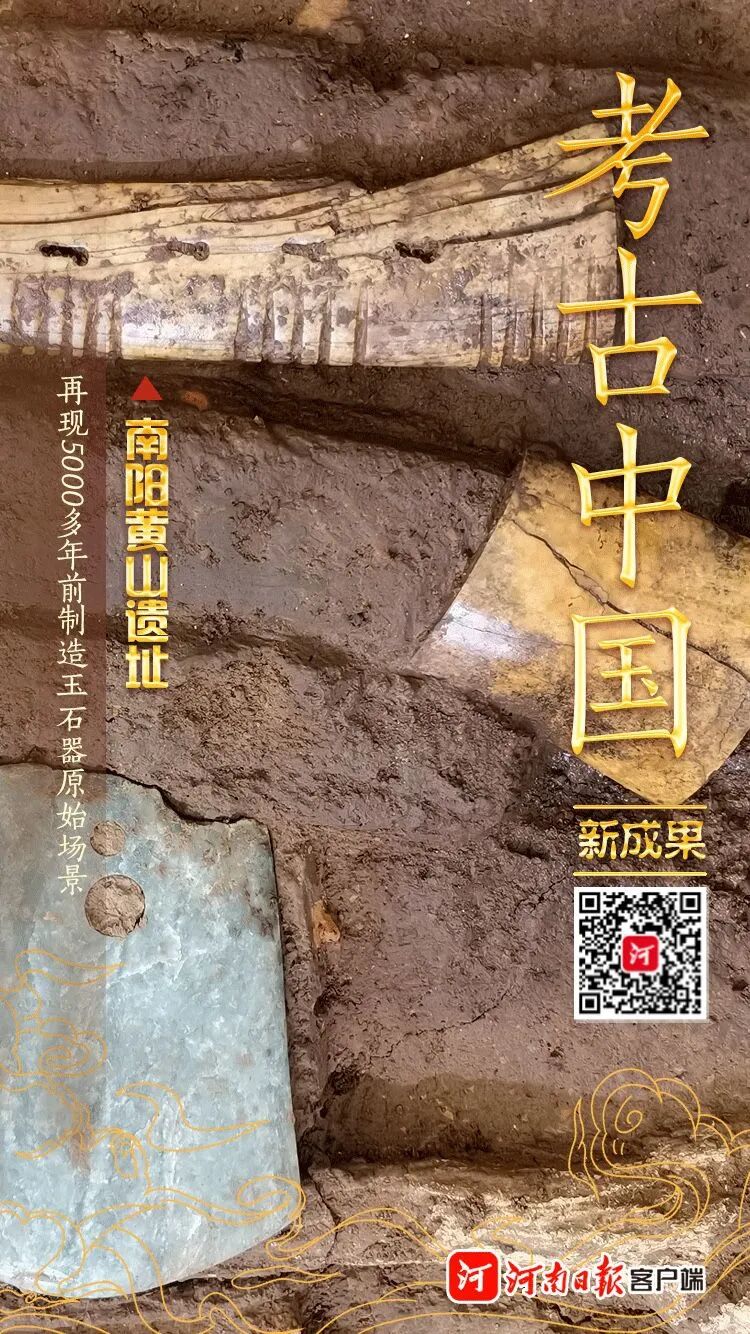 黄山遗址距离独山玉产地直线距离仅2.5公里,在此发现了仰韶文化晚期“前坊后居式”大型房址建筑,出土了丰富的玉石器、陶器、骨器等文物,被专家确认为我国目前发现的年代最早的玉石器制作大型聚落,再现古人制造玉石器的原始场景,堪称考古奇观。其体量之大、结构之复杂、保存之完好,国内罕见,填补了中原和长江中游地区新石器时代玉器作坊遗存的空白。