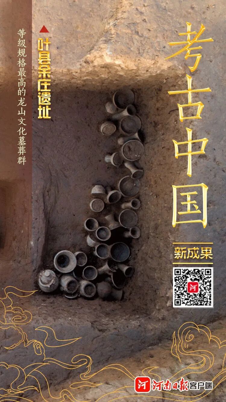 余庄遗址位于平顶山市叶县盐都街道余庄村村南。从目前的考古发现来看,该遗址是一处规模较大、文化内涵较单纯的龙山文化聚落遗址。编号M10的龙山墓葬,单棺仰身直肢葬,棺外北侧还陪葬一人,也为仰身直肢葬。墓内随葬器物有33件,均为陶器。这组陶器形体较小、制作较好,排列有序,器类成组,呈现出鲜明的礼制色彩。这是在河南境内目前已发现的随葬器物数量最丰富、等级规格最高的龙山文化墓葬。