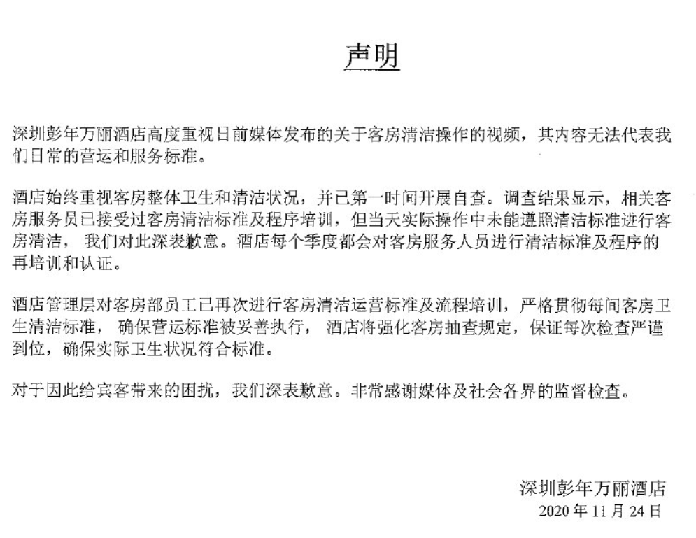 近日,网传“万豪国际集团旗下深圳彭年万丽酒店服务员用浴巾擦马桶”,引发网友热议。11月24日,深圳彭年万丽酒店官方微博发布声明称,客房服务员当天实际操作中未能遵照清洁标准进行客房清洁,酒店对此深表歉意。