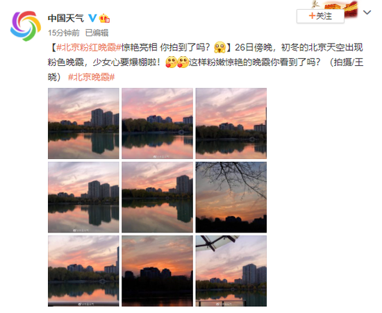 26日傍晚,初冬的北京天空出现粉色晚霞,少女心要爆棚啦!这样粉嫩惊艳的晚霞你看到了吗?