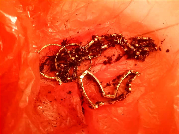 郝桂花随即找到“三金”给记者看。记者在一个红色塑料袋里看到,里面装有两个金耳环、一条金项链和一个金手镯,它们的颜色已经变得黯淡无光,其中还夹杂着一些毛发。