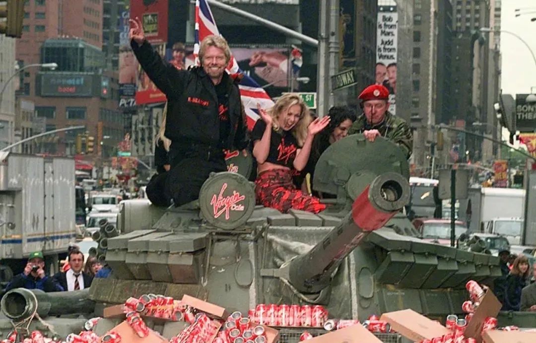 1999年为了让维珍可乐在美国上市,布兰森开了一辆坦克,碾压着可口可乐一路开进时报广场,向可口可乐宣战。