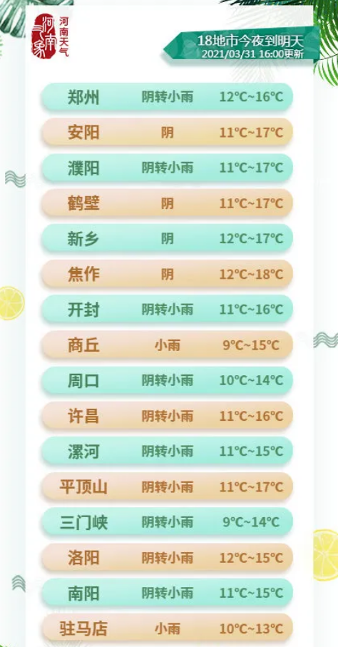 全省阴天,黄河以南大部分地区有小雨,其中信阳地区和南阳、驻马店两地区南部局部有中雨并伴有雷电;其它地区有零星小雨。