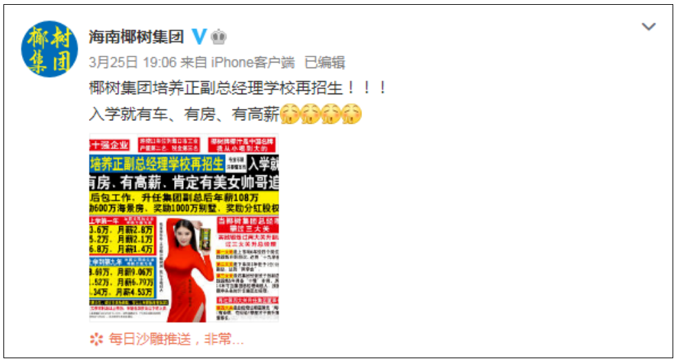近日,海南省市场监管局对椰树集团海南椰汁饮料有限公司发布涉嫌违法广告行为进行立案调查。此前,椰树集团在其官方微博上发布“椰树集团培养正、副总经理学校再招生!!!专业不限只要懂写作,入学就有车、有房、有高薪”等内容的广告,引发社会争议。
