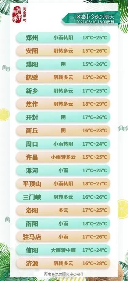 今天白天,黄河以南阴天,大部分地区有阵雨、雷阵雨,其中信阳地区和南阳、驻马店两地区南部部分地区有中雨,局部有大雨或暴雨并伴有短时强降水等强对流天气;其它地区阴天转多云。全省偏北风4到5级,阵风6到7级。今天夜里,南部阴天有小雨;其它地区多云。