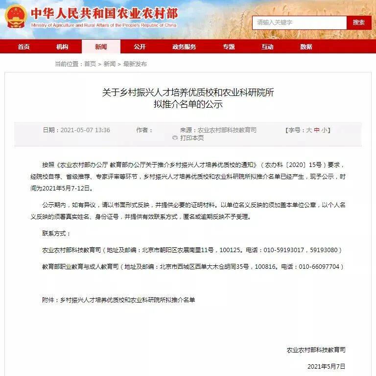 按照《农业农村部办公厅 教育部办公厅关于推介乡村振兴人才培养优质校的通知》要求,经院校自荐、省级推荐、专家评审等环节,农业农村部科技教育司日前公示了乡村振兴人才培养优质校和农业科研院所拟推介名单。我省五所院校在列:河南农业大学、河南农业职业学院、南阳农业职业学院、商丘职业技术学院、河南省农业广播电视学校夏邑分校。
