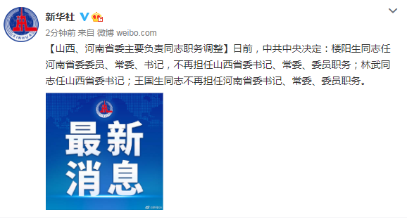 日前,中共中央决定:楼阳生同志任河南省委委员、常委、书记,不再担任山西省委书记、常委、委员职务;林武同志任山西省委书记;王国生同志不再担任河南省委书记、常委、委员职务。