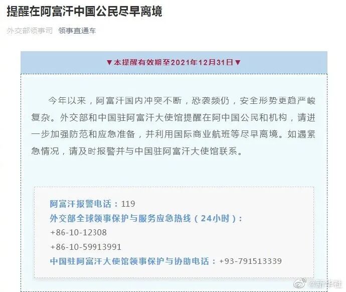 据外交部“领事直通车”微信公众号消息,今年以来,阿富汗国内冲突不断,恐袭频仍,安全形势更趋严峻复杂。外交部和中国驻阿富汗大使馆提醒在阿中国公民和机构进一步加强防范和应急准备,并利用国际商业航班等尽早离境。如遇紧急情况,请及时报警并与中国驻阿富汗大使馆联系。