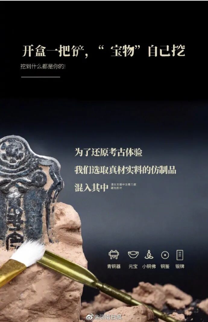 河南博物院考古盲盒将时下流行的“盲盒”概念和文物结合,把微缩“文物”藏进土中,让人们体验考古发掘乐趣。去年年底以来,线上线下经常卖到脱销,目前已销售26万个,现已布局天津、广州、深圳、哈尔滨、西安、兰州、沈阳、贵阳、长沙、吉林等全国多个省市区。
