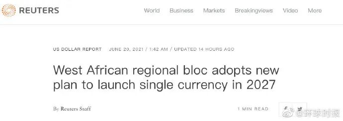 据路透社加纳首都阿克拉消息,西部非洲国家经济共同体15国峰会当地时间19日决定在2027年启动单一货币。西部非洲国家经济共同体主席让-克洛德·卡西·布鲁在记者招待会上宣布,2027年发行单一货币的路线图已在阿克拉举行的峰会上获得15国首脑批准,发行单一货币的目的是促进本地区贸易和经济增长。西部非洲国家经济共同体原计划在2020-2021年发行单一货币,因新冠疫情被推迟,新货币被命名为“Eco”。(参考消息)