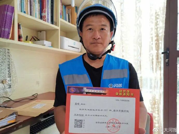 今年41岁的高明,是周口市区的一名快递员。2007年大学本科毕业后,结婚生子,过着普普通通的日子。2016年,在一位大学同学的鼓励下,他重拾梦想,历经5年拼搏之后,今年终于被石家庄铁道大学研究生院录取。他说:“挣钱养家重要,可梦想同样重要。”