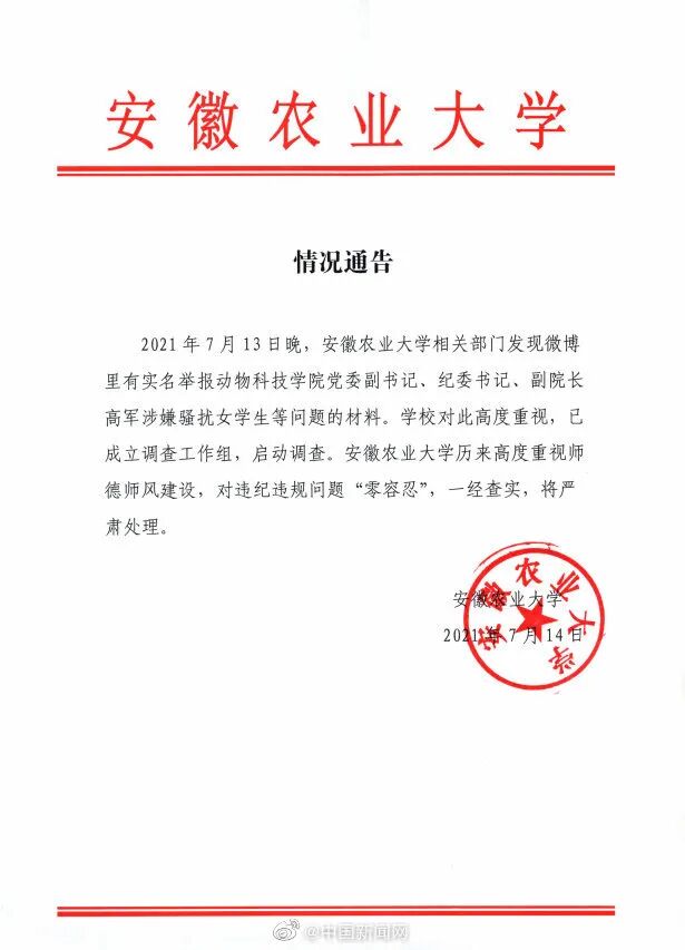 7月14日,安徽农业大学发布情况通告:2021年7月13日晚,安徽农业大学相关部门发现微博里有实名举报动物科技学院党委副书记、纪委书记、副院长高军涉嫌骚扰女学生等问题的材料。学校对此高度重视,已成立调查工作组,启动调查。安徽农业大学历来高度重视师德师风建设,对违纪违规问题“零容忍”,一经查实,将严肃处理。