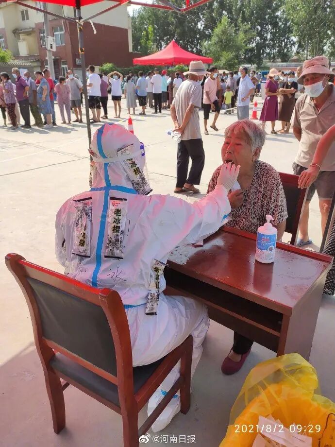 8月2日,在郑州航空港区的社区采集点内,来自郑州市第一人民医院的采集人员为应对高温,头上、腰间、背部贴满了老冰棍,希望能让自己凉快一点。当天,郑州市第一人民医院派出350人奔赴航空港区,分散在各个小区进行采集。烈日炎炎,医护人员辛苦了!