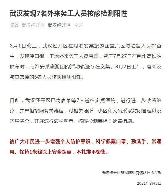 8月1日晚上,武汉经开区在对淮安某旅游团重点区域驻留人员排查中,发现沌口街一工地外来务工人员唐某,曾于7月27日在荆州高铁站候车时,与淮安某旅游团的活动轨迹存在交集。8月2日上午,唐某及与其密接的6名人员核酸检测阳性。目前,武汉经开区已将唐某等7人送往定点医院,进行进一步诊断治疗,并严格按照有关流程,对相关场所、小区和人员采取封闭管理以及环境消杀,开展流行病学调查、核酸检测等相关处置措施。