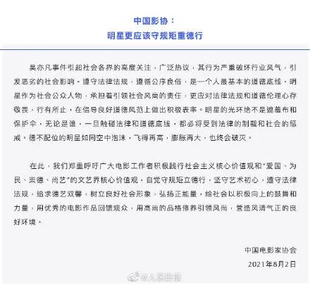 2日,中国影协、中国音协、中国视协就吴亦凡事件发声。中国影协:德不配位的明星如同空中泡沫,飞得再高,膨胀再大,也终会破灭。中国音协:健康的行业风气是音乐事业繁荣发展的重要保证。中国视协:所谓顶级流量、粉丝后援、外籍身份都不具备为所欲为的特权,绝不是违法失德的护身符。