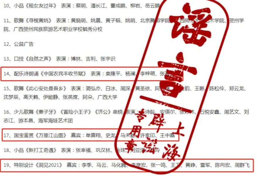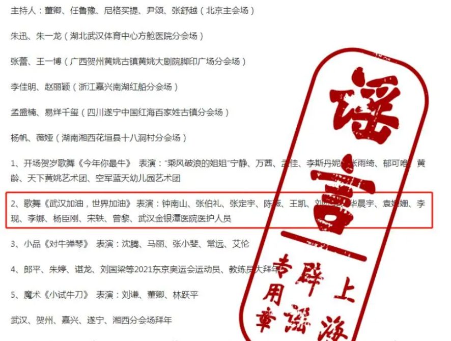 近日,还有多份“2021年春晚节目单”开始在网上流传。其中最“迷幻”的一份,在歌舞《武汉加油,世界加油》中,竟然出现了钟南山、张伯礼、陈薇、武汉金银潭医院医护人员和明星同台演出的安排。而配乐诗朗诵《中国农民丰收节赋》的表演者竟然是袁隆平等......