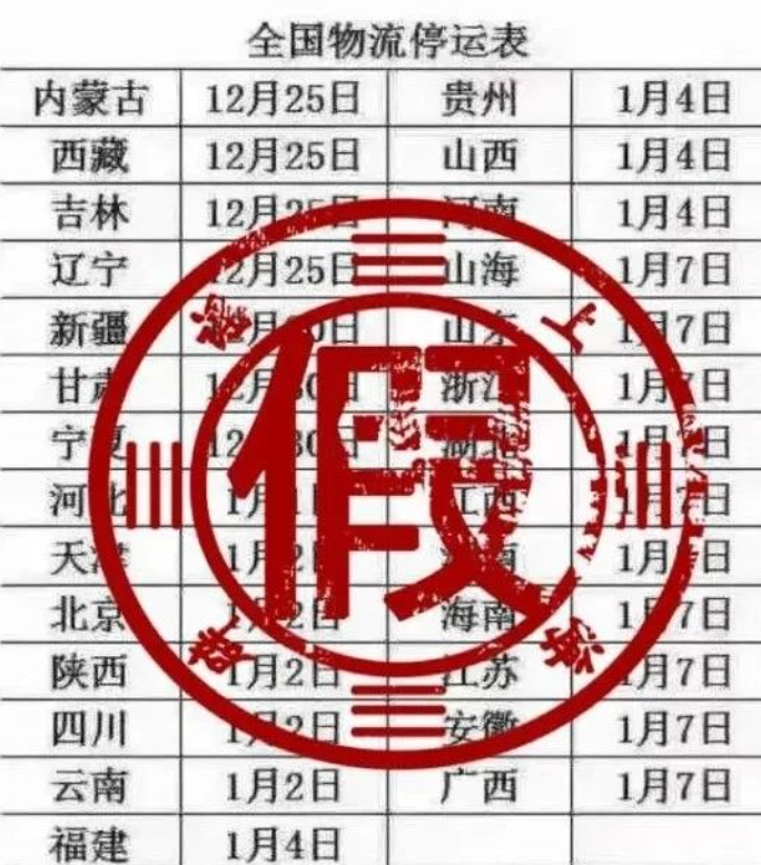 另据上海网络辟谣消息,一张“全国物流停运时间表”也广为流传。表上详细标注了2021年春节期间全国物流停发的时间,包括广西在内,多地1月初就会停运。