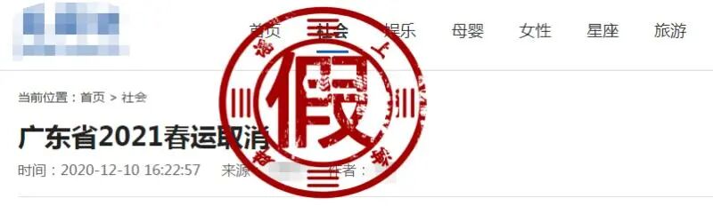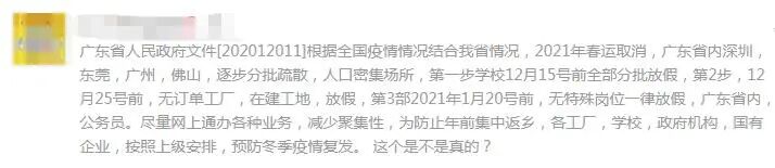 近日,某网站发布了一篇《广东省2021春运取消》的文章,称有一份“广东省人民政府文件”表示:“根据全国疫情情况结合我省情况,2021年春运取消。”还煞有介事地提到了“三步走放假”,第一步就是“学校12月15号前全部分批放假”。