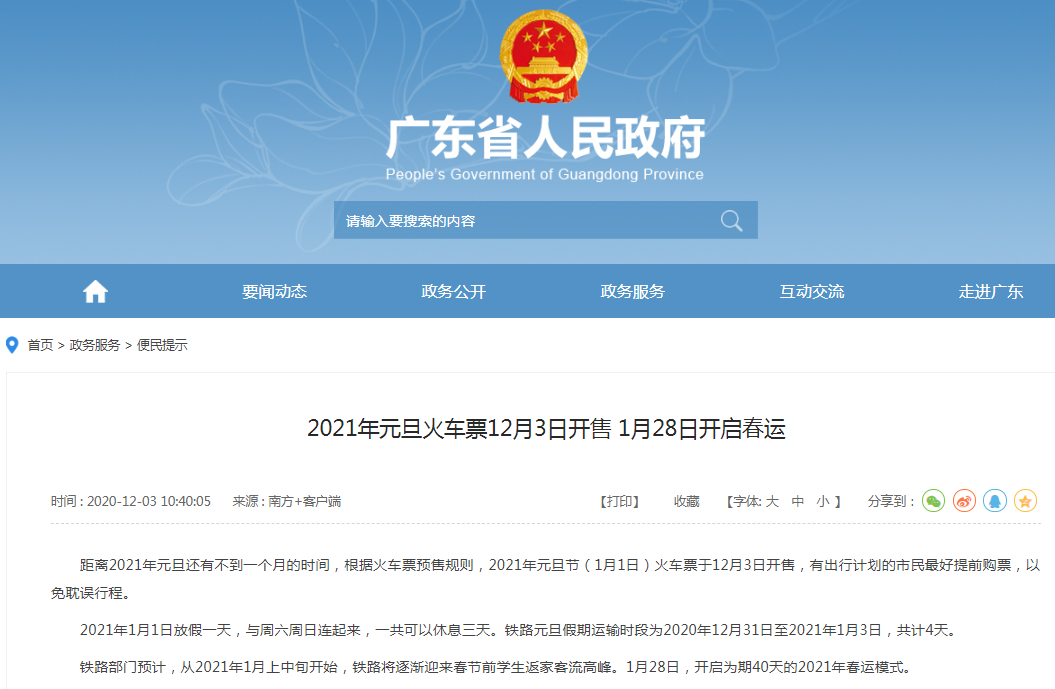 事实上,12月3日,广东省人民政府官网上发布了《2021年元旦火车票12月3日开售 1月28日开启春运》一文,文章中明确表示“1月28日,开启为期40天的2021年春运”。“春运取消”的传言不攻自破!