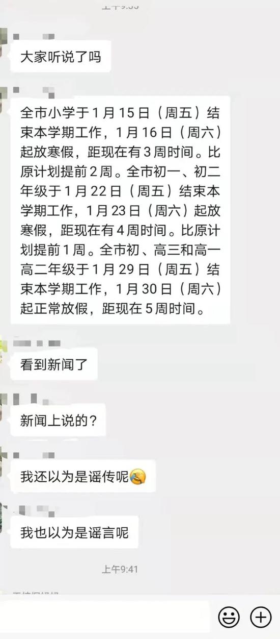 今日网上流传的《通知》称,全市小学于1月15日(周五)结束本学期工作,1月16日(周六)起放寒假,距现在有3周时间,比原计划提前2周。全市初一、初二年级于1月22日(周五)结束本学期工作,1月23日(周六)起放寒假,距现在有4周时间。比原计划提前1周。全市初、高三和高一高二年级于1月29日(周五)结束本学期工作,1月30日(周六)起正常放假,距现在5周时间。