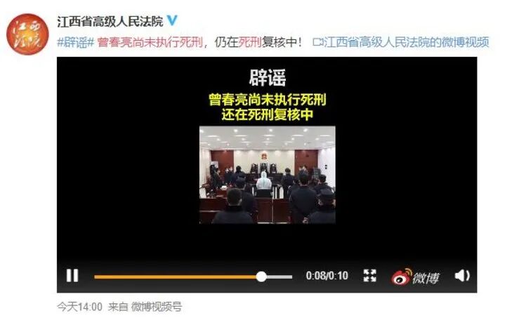 4月20日下午,江西省高级人民法院官方微博发布辟谣信息:曾春亮尚未执行死刑,仍在死刑复核中!