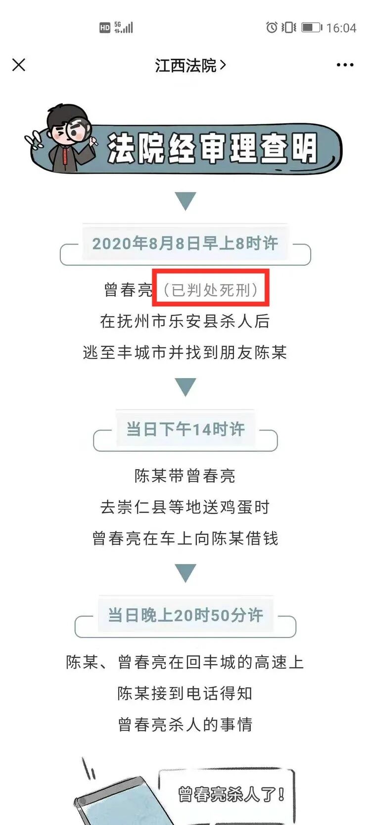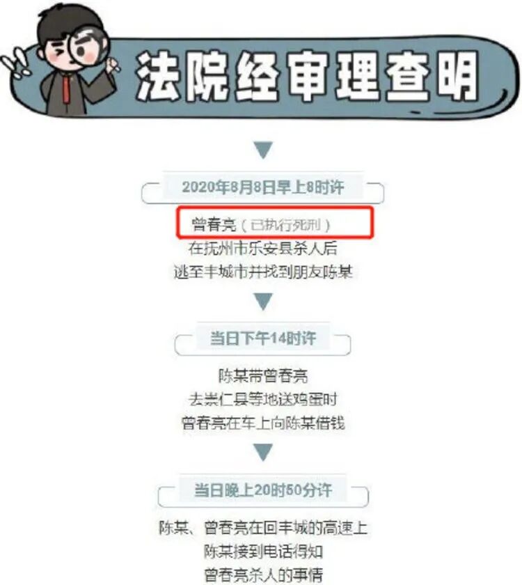 20日上午,江西高院微信公众号发布消息《帮曾春亮逃匿!江西一男子获刑!》,其中称曾春亮已被执行死刑。