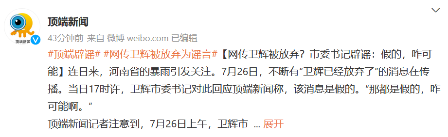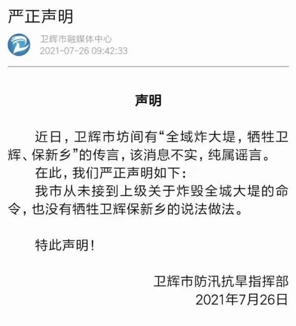 连日来,河南省的暴雨引发关注。7月26日,不断有“卫辉已经放弃了”的消息在传播。当日17时许,卫辉市委书记对此回应:“那都是假的,咋可能啊。”7月26日上午,卫辉市委书记发表视频讲话表示,当前卫辉市正在组织全体机关干部抽排水,当天下午卫辉市的水位就会明显下降,希望广大市民不要恐慌。