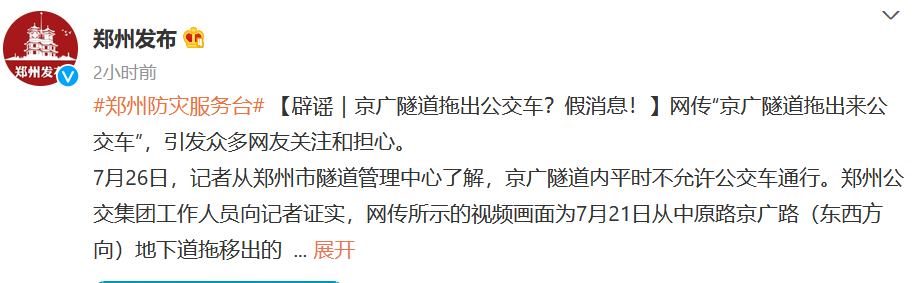 网传“京广隧道拖出来公交车”,引发众多网友关注和担心。7月26日,据郑州市隧道管理中心回应,京广隧道内平时不允许公交车通行。经郑州公交集团工作人员证实,网传所示的视频画面为7月21日从中原路京广路(东西方向)地下道拖移出的B5路公交车。