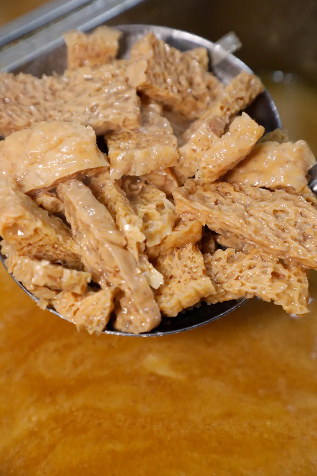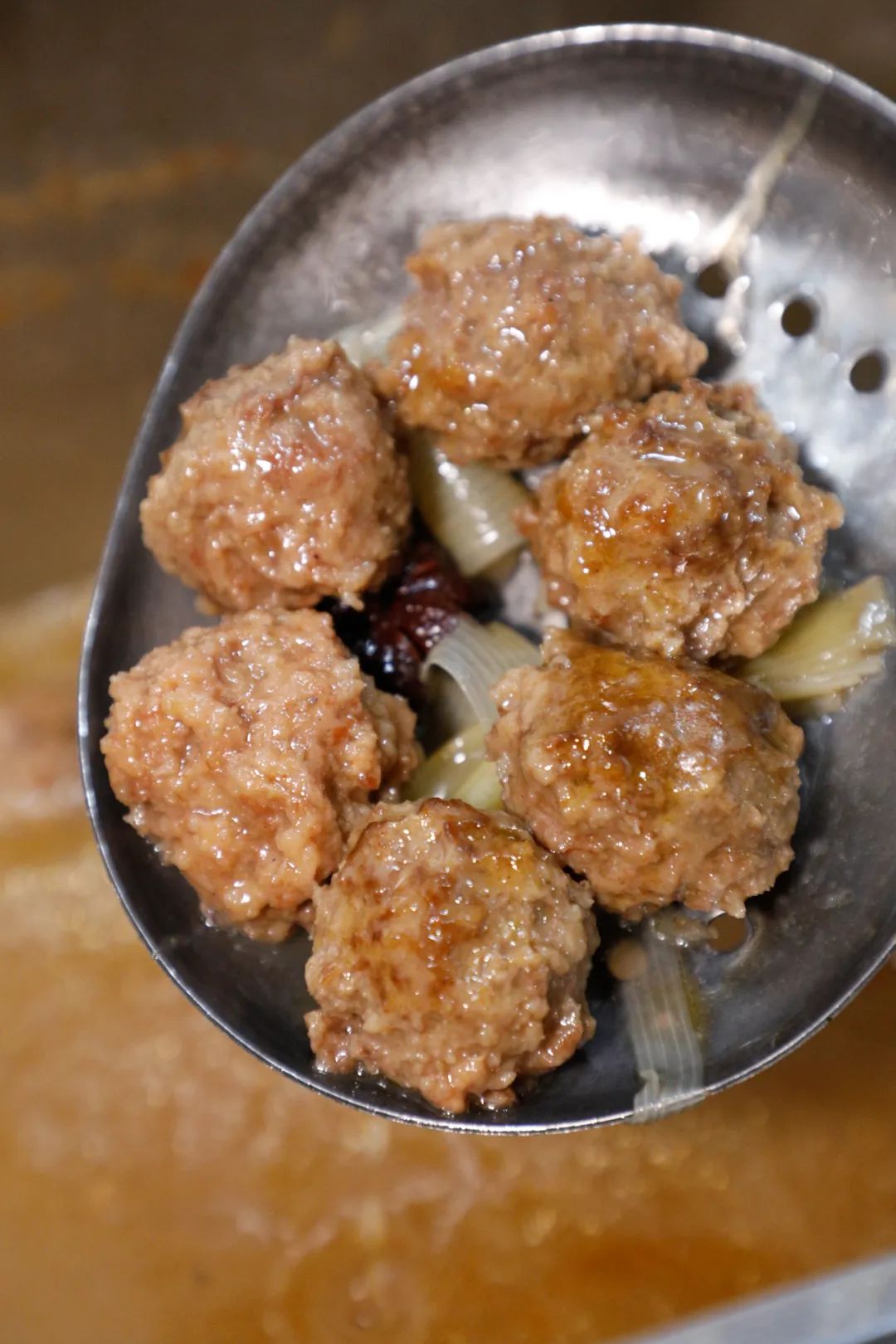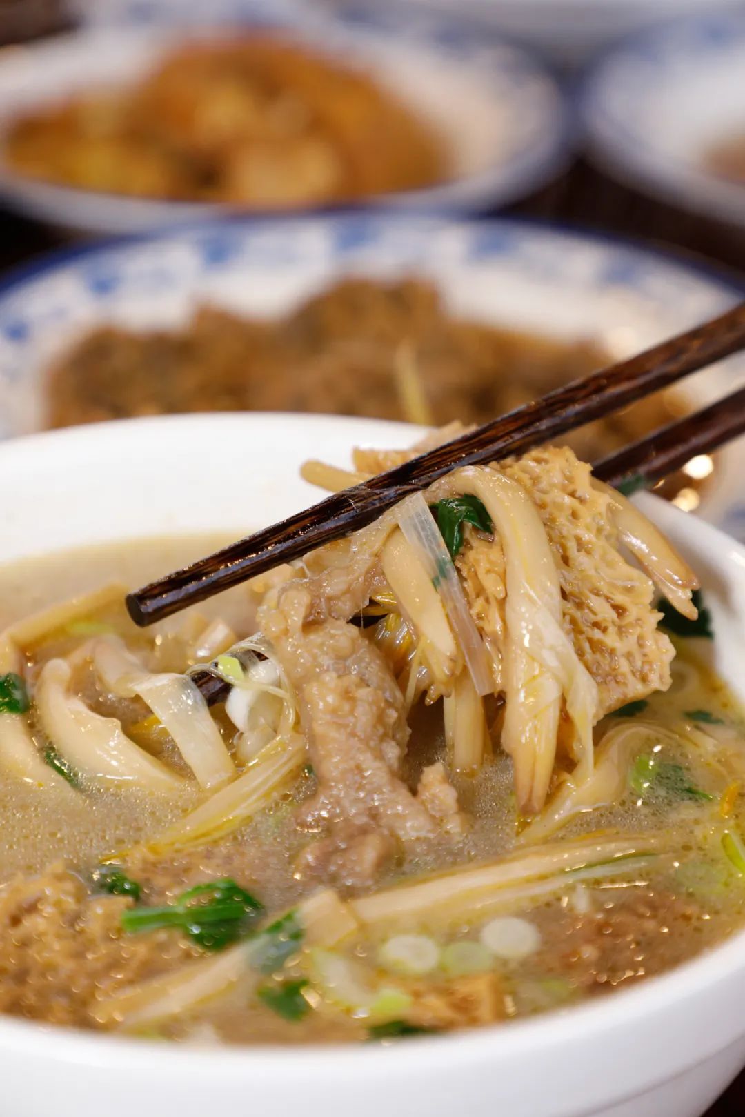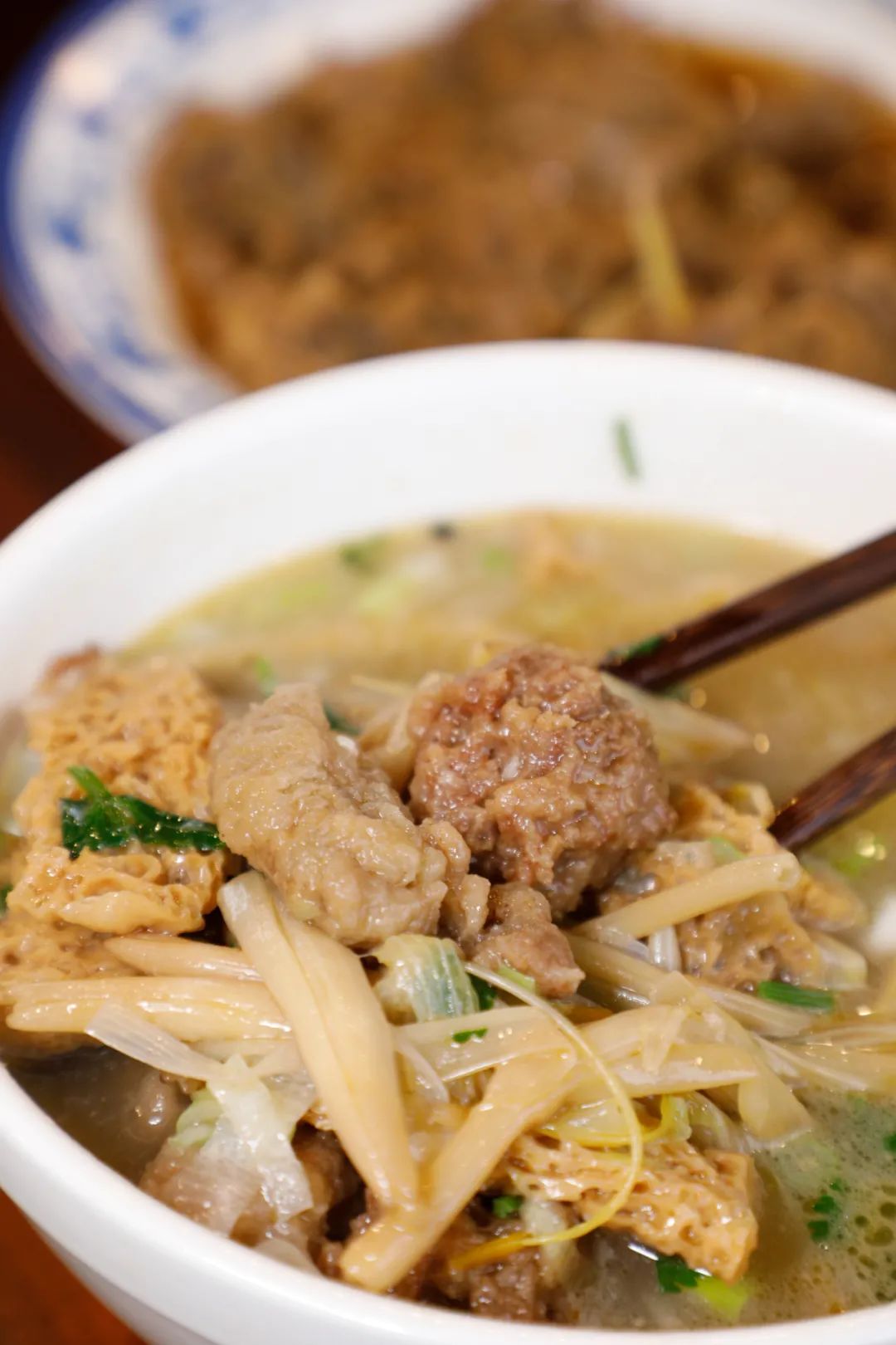 面筋缝隙里灌满了汤汁,入口油润香软;黄花菜筋筋的口感中带着脆嫩的鲜;牛酥肉和丸子就更没得说,一个浑实饱满、一个外软嫩筋,各有各的香。