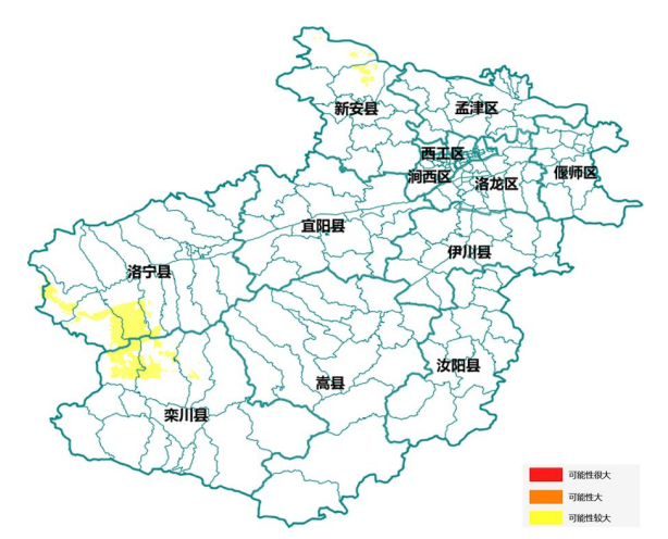 地质灾害黄色预警地区:新安县局部、洛宁县局部、栾川县局部,发生崩塌、滑坡等地质灾害的可能性较大。