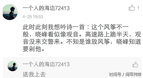 有 网友评论到:我想吟诗一首!这个风筝不简单,好似观音下凡间。好似观音下凡间呐,这个风筝不简单。也有网友说到此时此刻我想吟诗一首:晓峰晓峰遇观音,高 速路上一顿闻,交警一来你全完,罚款不算还扣分,更有网友说到王八犊子放风筝,疑似观音显真身。晓峰高速下车跪,罚了两百扣三分。呵呵太多了诗歌太多了, 下面小编就截取部分截图,注意观看